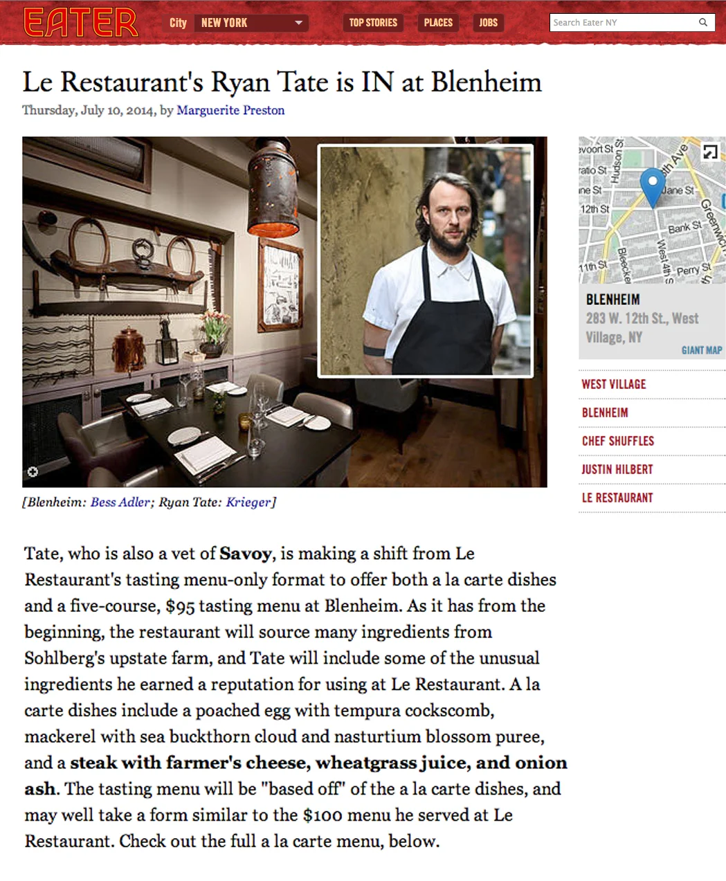 Eater: Le Restaurant's Ryan Tate is IN at Blenheim